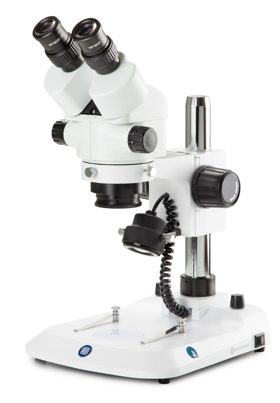 Microscopio binocular estereoscópico con zoom StereoBlue, objetivo con zoom de 0,7x a 4,5x, aumento de 7x a 45x, soporte ergonómico de columna con iluminación LED incidente y transmitida. Euromex