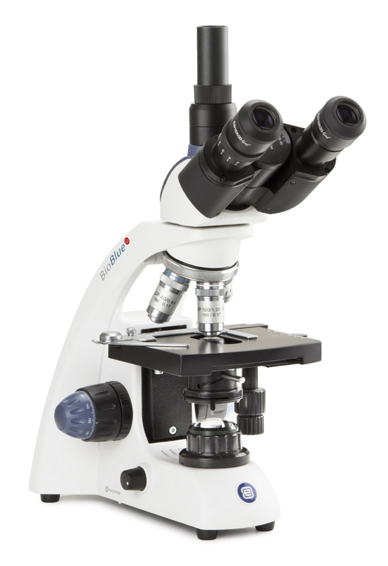 Microscopio trinocular BioBlue EVO con oculares WF10x/20 mm, objetivos de aceite SMP 4/10/S40/S100x con platina mecánica e iluminación Köhler inalámbrica NeoLED™ de 1 W Euromex