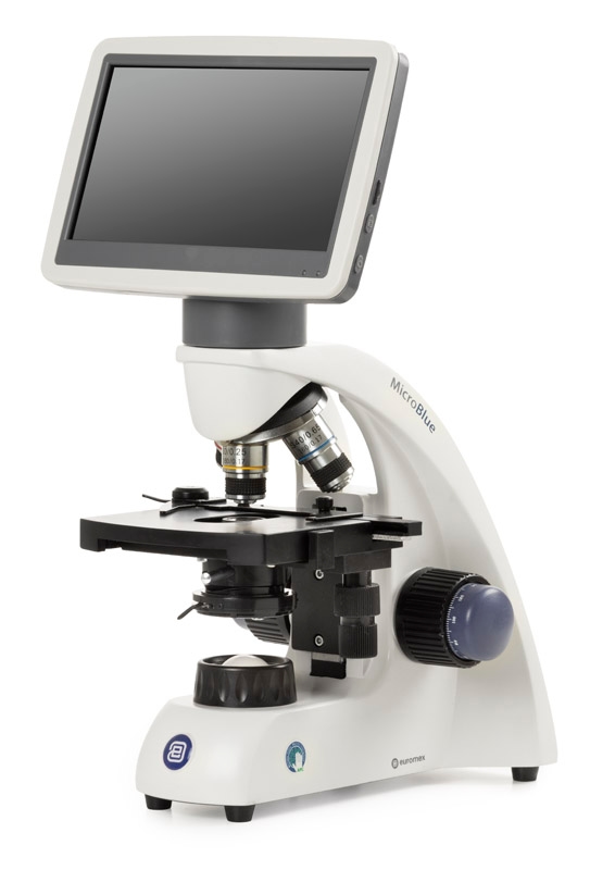 Microscopio MicroBlue MB.1051-LCD monocular con pantalla LCD integrada, ideal para enseñanza y observación en laboratorios.