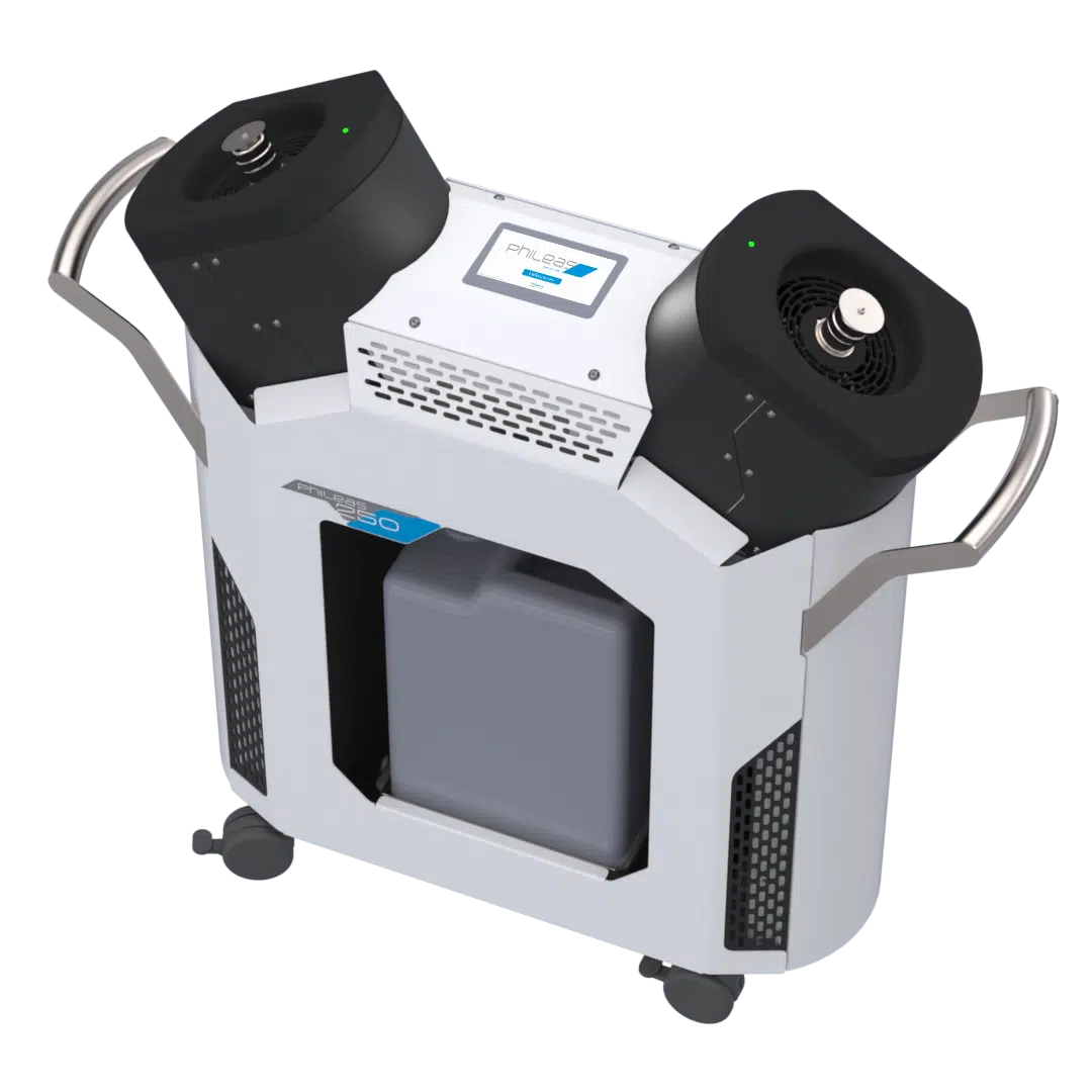 El Phileas® 250 desinfecta el aire y las superficies de forma rápida y segura en laboratorios, hospitales, plantas de producción y áreas limpias de gran tamaño. Este equipo aplica peróxido de hidrógeno en forma de niebla fina, lo que distribuye el desinfectante de manera uniforme y elimina los microorganismos de forma eficaz. Su gran capacidad y diseño resistente permiten cubrir espacios amplios que necesitan altos niveles de bioseguridad.